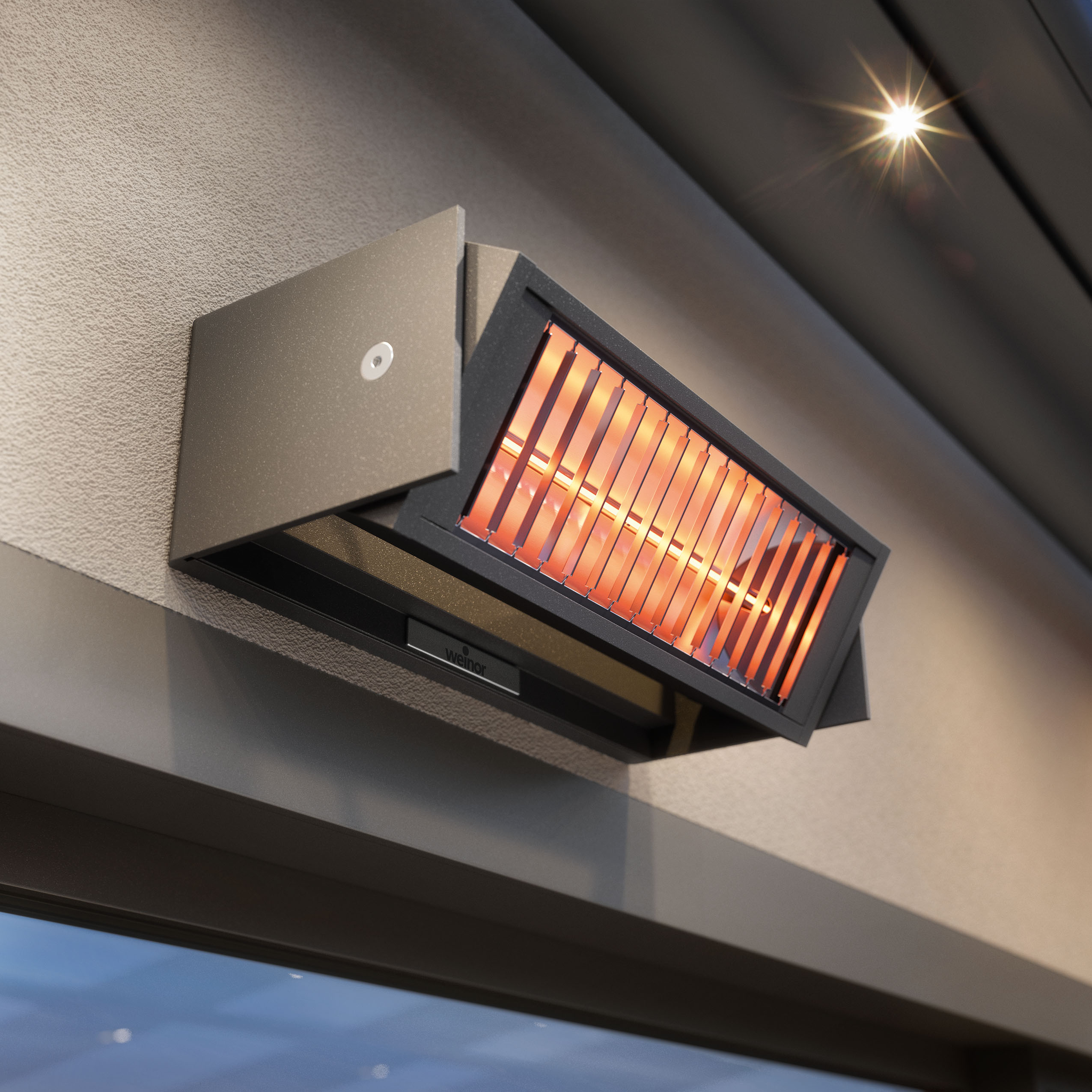 Tempura Quadra ensures maximum wellbeing and enjoyment on the patio with instant heat thanks to modern infrared technology. The heat is felt immediately on the skin, with no heating up phase and even with gusts of wind. Another bonus: Tempura Quadra is finished in the plant's own powder coating. This allows for high quality and a large range of colours. As a result, the box can be provided with the same coloured coating as the awning or patio roof frame.